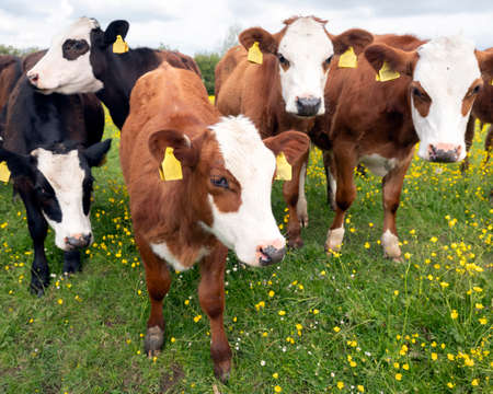 Herd of young calves in a field at sunset, the soft light outlining their curious faces.