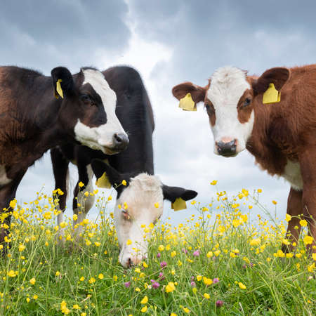 calves in spring meadow full of yellow buttercups under blue sky with clouds