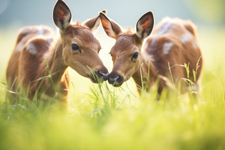 twin moose calves grazing in a sunny meadow