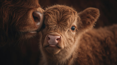 A close-up captures a young calf with soft, brown fur alongside its mother. The image showcases detailed textures and a warm, natural color palette. The composition emphasizes intimacy, likely taken in a farm or rural setting. Suitable for various projects, including editorial features and commercial advertising.