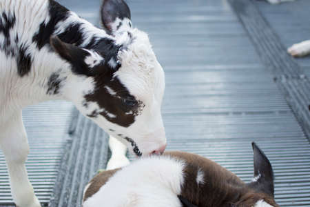 Cows in farm. Calf play happily. Dairy cows. selective focus.