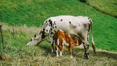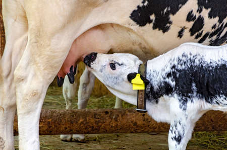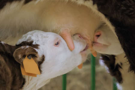 Close up: cute brown and white calf drinking milk from mother cow udder in stable at agricultural animal exhibition, cattle farm. Farming, suckling, feeding, agriculture and concept.