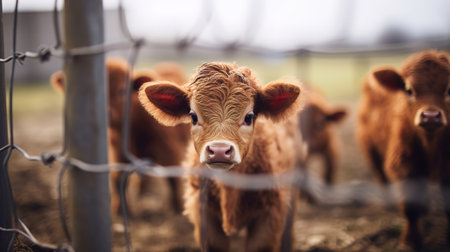 Generative AI, little calfs looking at the camera on a farm, baby cows