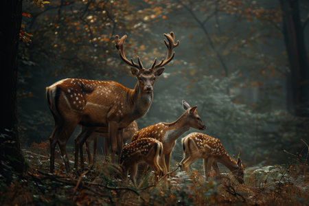 Young and adult deer peacefully coexisting in serene and natural forest environment