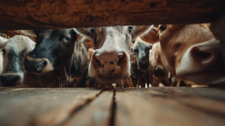 A fascinating close-up shows curious cows peering through a wooden fence in a barn, highlighting the charm and essence of farm life.