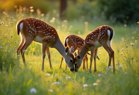 A serene scene of a deer family grazing peacefully in a sunlit meadow, surrounded by blooming wildflowers and lush green grass.