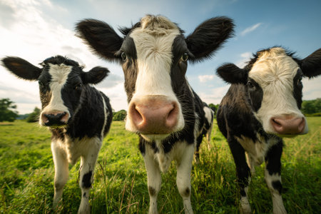 Three black and white Belted Galloway cows stand together in a vibrant green field. The late afternoon sun illuminates their detailed fur and expressive eyes, creating a peaceful scene.