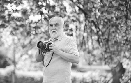 travel concept. male photographer enjoy cherry blossom. travel and walking in cherry blossom park. hobby at retirement. tourism and holiday. traveler camera man under sakura bloom