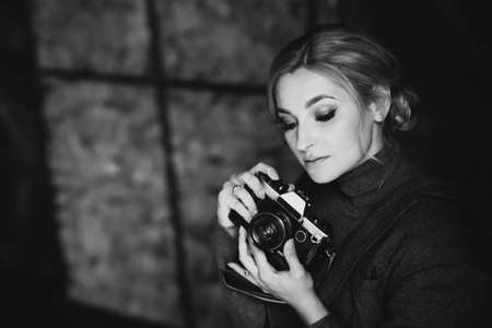 Beautiful girl blonde photographer in a strict suit holds in his hands the old retro camera. Black and white photo. Horizontal copy space