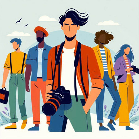 Vector illustration of a photographer with a camera on the background of a group of people.
