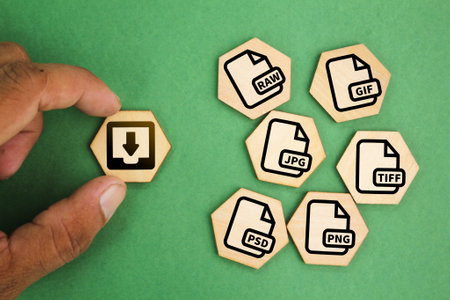 wooden hexagon with save file icon or download file format JPEG, PNG, GIF, TIFF, PSD And RAW file. files are saved into folders. Concept document management system or DMS. Highest