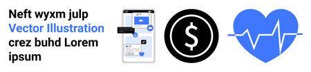E-commerce, digital finance, online healthcare, mobile applications, health monitoring, payment systems. Smartphone interface, currency symbol heart with pulse line. E-commerce and digital finance
