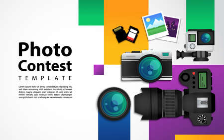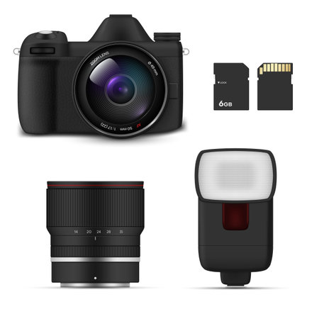 Photography equipment. Camera, flash, camera, flash, lens. Vector illustration