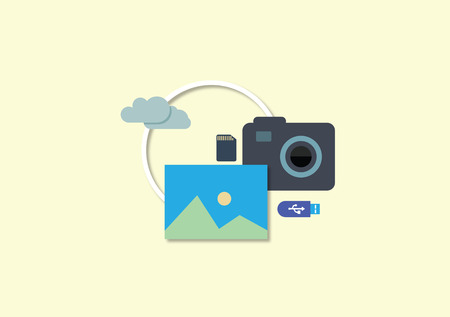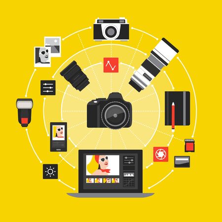 Photography and photography flat icons set. Vector illustration of camera, lens, flash, camera, lens, tripod, shutter, camera, camera, flash, lens, flash, shutter, camera, picture, picture, landscape