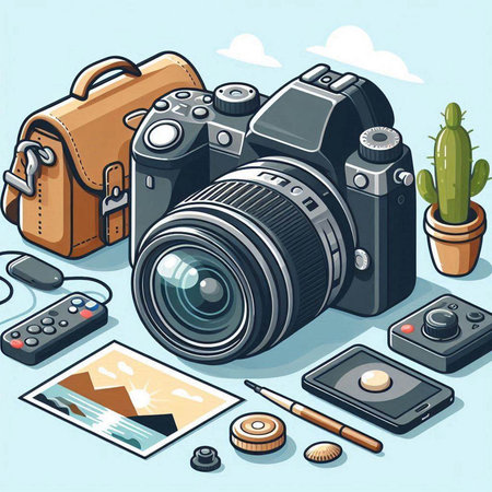 Vector illustration of a set of objects for a photographer. Camera, camera, camera, cactus, calculator, notebook, pen, pencil, camera.