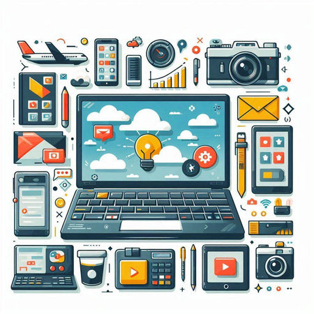 An AI illustration of An AI generated illustration of An array of professional camera equipment arranged on a white background