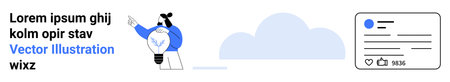 Online identity, social networking, digital services, user profiles, cloud storage, verification process. Person pointing to a virtual profile icon with data and clouds. Online identity and social