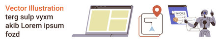 Business automation, workflow management, invoicing, robotics, digital navigation, technology concepts. Open laptop, map marker invoice robot in sequence. Business automation and workflow