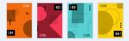 Abstract brochure covers set in modern minimal geometric design. Memphis style background templates with different colors shapes and elements pattern composition in A4 format. Vector illustration