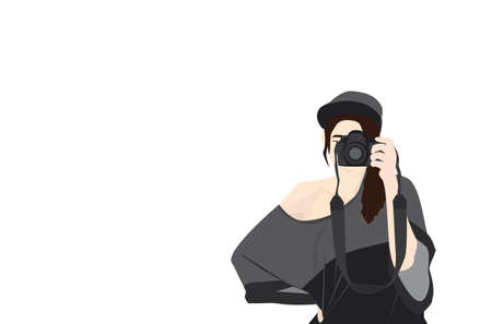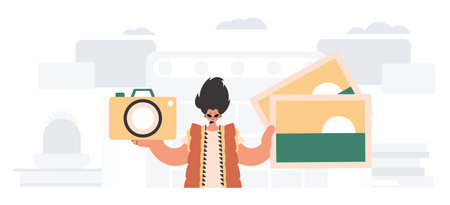 The individual holds a camera and photos in his hands. The concept of rest and travel. Trendy style, Vector Illustration