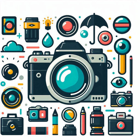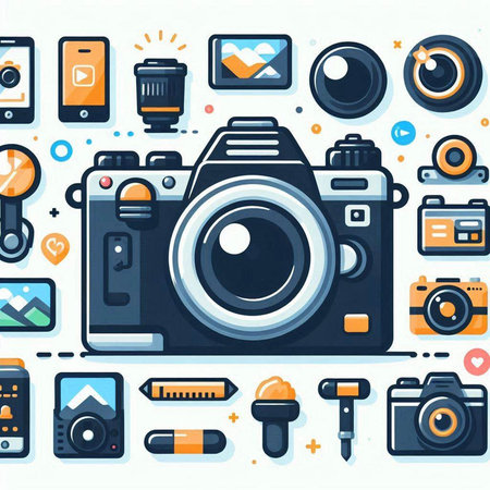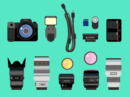 Photography equipment flat icons set. Vector illustration of camera, lens, flash, flash, compact disk, camera, flash, mirrorless camera, photo editing.