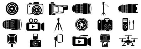 Photography equipment flat icons set. Vector illustration of camera, camera, lens, flash, tripod, camera, camera, flash, video camera and other elements