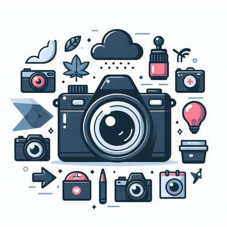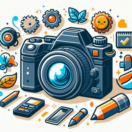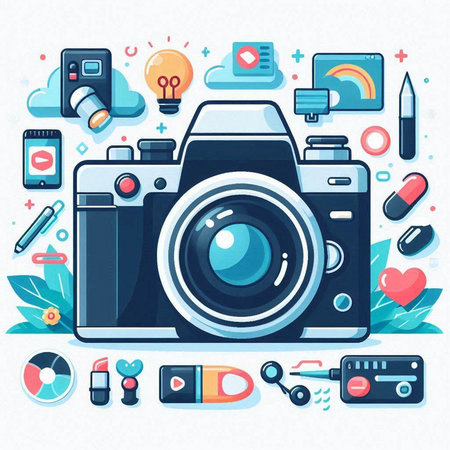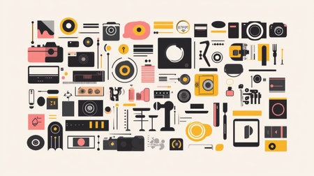 A vibrant illustration featuring a collage of vintage cameras and audio equipment, perfect for artistic projects, media use, and graphic design concepts.