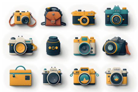 Collection of Colorful Cartoon-Style Cameras and a Camera Case
