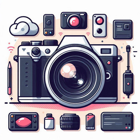 Camera and camera equipment. Vector illustration in cartoon style on white background.