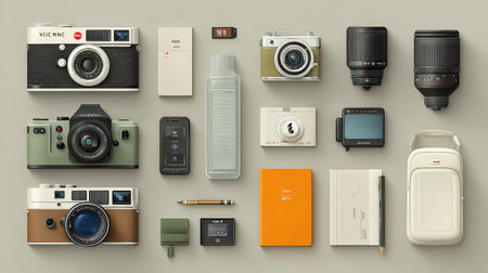 A curated flat lay display featuring various photography equipment, including cameras, lenses, accessories, and a notebook, showcasing creativity and design.