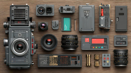 A visually appealing arrangement of various camera lenses and accessories on a dark surface, showcasing the intricate details and designs of each component.