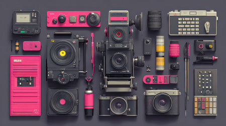 A vibrant arrangement of retro photography equipment featuring cameras, lenses, and accessories. This artistic display showcases vintage tools on a dark background, perfect for creative projects.