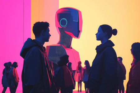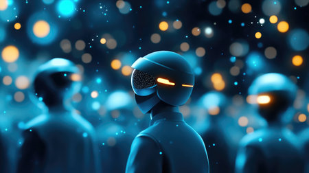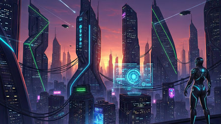 A vibrant cityscape showcases robots and humanoids amidst holographic displays. The artwork features a futuristic aesthetic with neon lines, digital interfaces, and architectural elements. The lighting emphasizes the technological theme, hinting at innovation. Suitable for various applications, including editorial and commercial design projects.