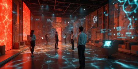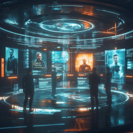 In a sleek, modern space, six individuals stand engaged in discussion, surrounded by floating holographic screens displaying data and images.