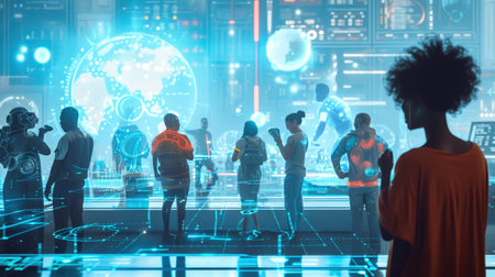 This captivating image illustrates a futuristic scene with silhouetted figures standing amidst a glowing digital sphere, symbolizing connection and innovation in technology.