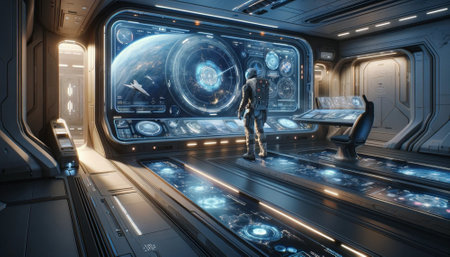 View of a futuristic space station with a futuristic interface 3d rendering