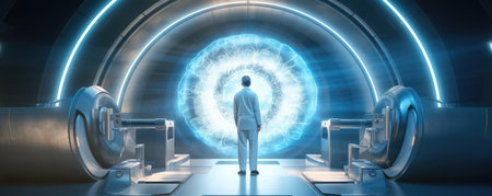 Man standing in front of large circular door. Generative AI.