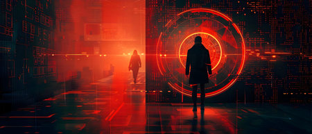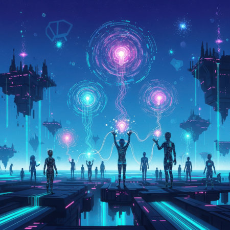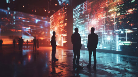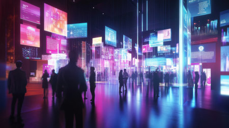 Explore a futuristic digital landscape filled with silhouetted figures engaged with vibrant neon data streams, creating a unique environment of innovation and technology.