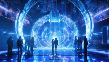 Futuristic terminal showcasing holographic displays and passengers engaged with technology