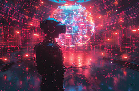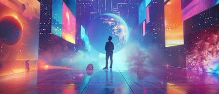 Silhouette stands in cyber world, surrounded by neon glowing digital grids and floating spheres. Person in futuristic metaverse