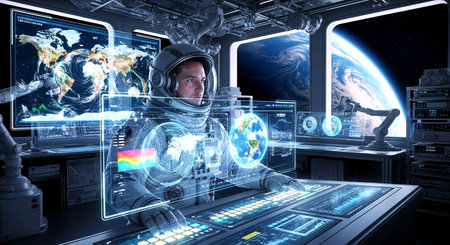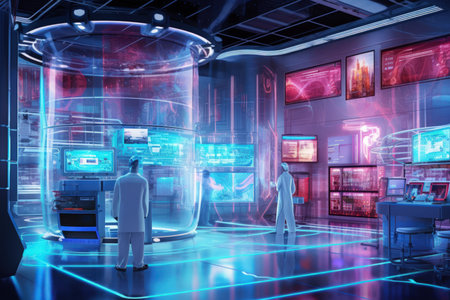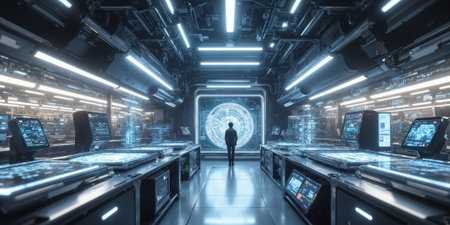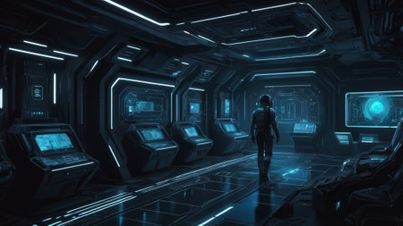 Futuristic Data Nexus A dramatic high-angle view of a state-of-the-art control center where intricate networks of data streams and interactive