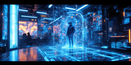 Futuristic Data Center Server Room Holographic Display Person looking at glowing screen in high tech control room