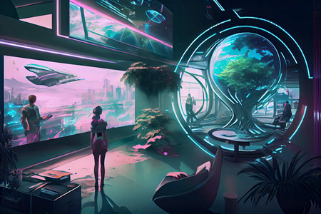 This image showcases a modern interior space, possibly a lounge or waiting area, with a strong emphasis on technology. The scene features sleek furniture, ambient lighting, and digital interfaces integrated into the walls. It evokes a futuristic atmosphere through its design and use of digital displays, potentially suitable for editorial or commercial applications.