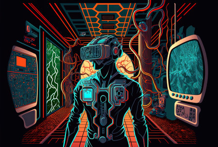 Virtual reality with network gaming and simulation in the Metaverse backdrop image for a video game featuring a sci fi ai robot