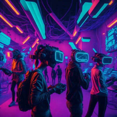 A striking visual of mannequins wearing virtual reality headsets showcases a vibrant environment filled with neon lights, creating an engaging futuristic atmosphere.