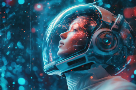 An astronaut with a reflective helmet gazes thoughtfully into a dynamic, colorful digital universe.