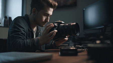 A dedicated man adjusts his camera, seeking the perfect shot in a studio.