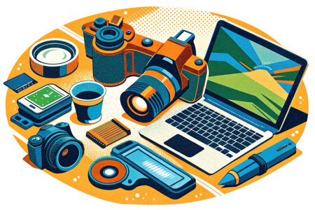 Photographer workspace with laptop and camera. Vector illustration in retro style