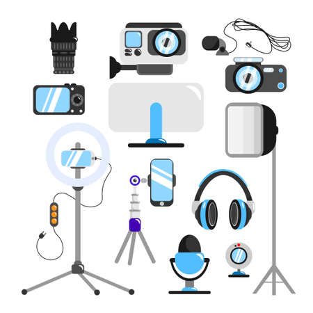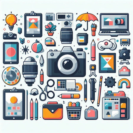 Photography icon set with photo, camera equipment. Colour flat version. Vector illustration