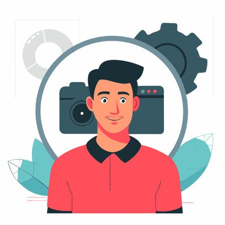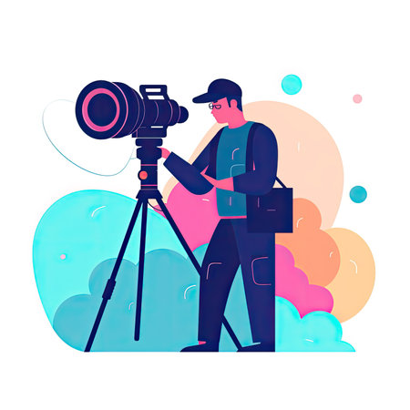 Caucasian cameraman looking through movie camera on a tripod. Young cameraman with professional video camera. Hipster cameraman taking a video. flat design illustration. Generative AI